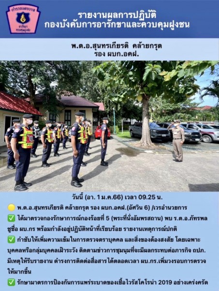 (1 ม.ค. 66) ตั้งแต่เวลา 09.00 น. พ.ต.อ.สุนทรเกียรติ คล้ายกรุต รอง ผบก.อคฝ. ( อัศวิน 6 ) เวรอำนวยการ ได้ร่วมประชุม Conference กับ กอร.รพ.จุฬาฯและออกตรวจพื้นที่รับผิดชอบ กำชับการปฏิบัติหน้าที่เคร่งครัด รายงานเหตุการณ์ทั่วไปปกติ