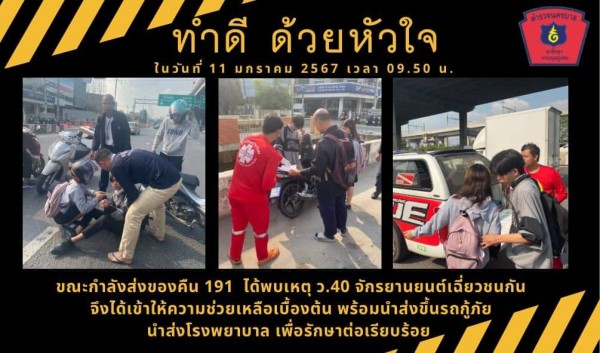ตำรวจทำความดี ด้วยหัวใจ ส.ต.ต.ภูมิพัฒน์ สุทธไชย และ ส.ต.ต.นิติพนธ์ ไขยพรม ผบ.หมู่ กองร้อยที่ 1 กก.ควบคุมฝูงชน 1 บก.อคฝ. ช่วยเหลือประชาชน เหตุจักรยานยนต์เฉี่ยวชนกัน ได้เข้าช่วยเหลือเบื้องต้น พร้อมนำส่งขึ้นรถกู้ภัย เพื่อนำส่งโรงพยาบาล