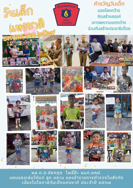 วันเด็กแห่งชาติ ๑๓ มกราคม ๒๕๖๗ คำขวัญวันเด็กแห่งชาติประจำปี ๒๕๖๗ มองโลกกว้าง คิดสร้างสรรค์ เคารพความแตกต่าง ร่วมกันสร้างประชาธิปไตย พล.ต.ต.ชัยกฤต โพธิ์อ๊ะ ผบก.อคฝ. มอบของเล่นให้แก่ ลูก หลาน ของข้าราชการตำรวจในสังกัด เนื่องในโอกาสวันเด็กแห่งชาติ ประจำปี ๒๕๖๗ _______________________________________ #วันเด็กแห่งชาติประจำปี๒๕๖๗ #อารักขาและควบคุมฝูงชน
