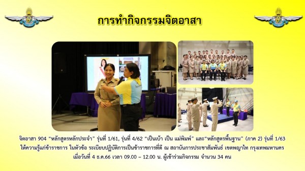 วันที่ 4 ธันวาคม 2566 เวลา 08.00-12.00 น. วิทยากรจิตอาสา บก.อคฝ. ส.ต.ต.วันเฉลิม ผลพัฒนา ผบ.หมู่ กองร้อย1 กก.ควบคุมฝูงชน 2 บก.อคฝ. เป็นวิทยาจิตอาสา904 บรรยายให้ความรู้กับข้าราชการพลเรือนสามัญ ที่อยู่ระหว่างการทดลองปฏิบัติหน้าที่ราชการ กรมประชาสัมพันธ์ รุ่นที่ 31 จำนวน 35 คน ในหัวข้อ ระเบียบปฏิบัติการเป็นข้าราชการที่ดี ,ระเบียบการแต่งกายของข้าราชการ, การประดับเข็มในพิธีการต่างๆ และการฝึกปฏิบัติการจัดระเบียบแถว การถอดหมวก การสวมหมวก การถือและวางหมวก การวันทยหัตถ์ การแสดงความเคารพ การประดับอินธนู และการรับมอบประกาศนียบัตร ณ ห้อง Studio ชั้น 1 อาคาร สถาบันการประชาสัมพันธ์ เขตพญาไท กรุงเทพมหานคร